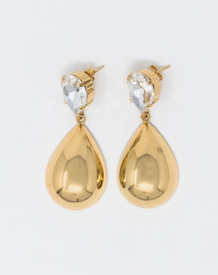 Orecchini pendenti in ottone placcato oro 18k con pietra Swarovski al lobo e pendente a forma di goccia con superficie liscia. La pietra è disponibile in altri colori su richiesta.