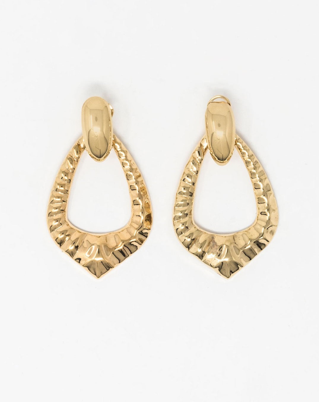 Orecchini pendenti in ottone placcato oro 18k con elemento gilda al lobo e pendente dalla forma a goccia con superficie martellata. L'elemento pendente può essere tolto e si può indossare anche solo la gilda.