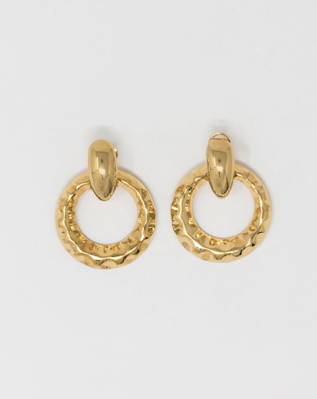 Orecchini pendenti in ottone placcato oro 18k con elemento gilda al lobo e pendente dalla forma circolare con superficie martellata. L'elemento pendente può essere tolto e si può indossare anche solo la gilda.