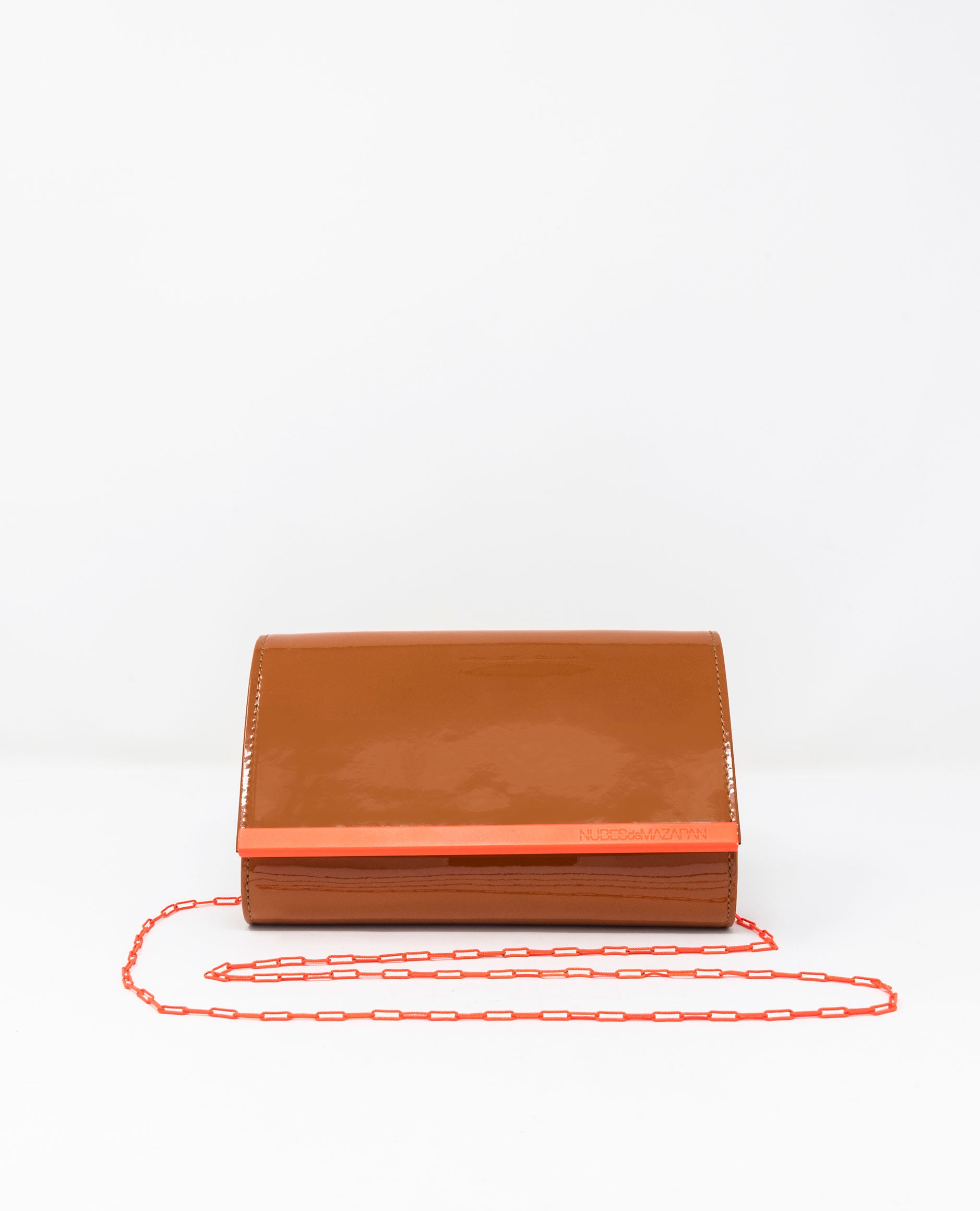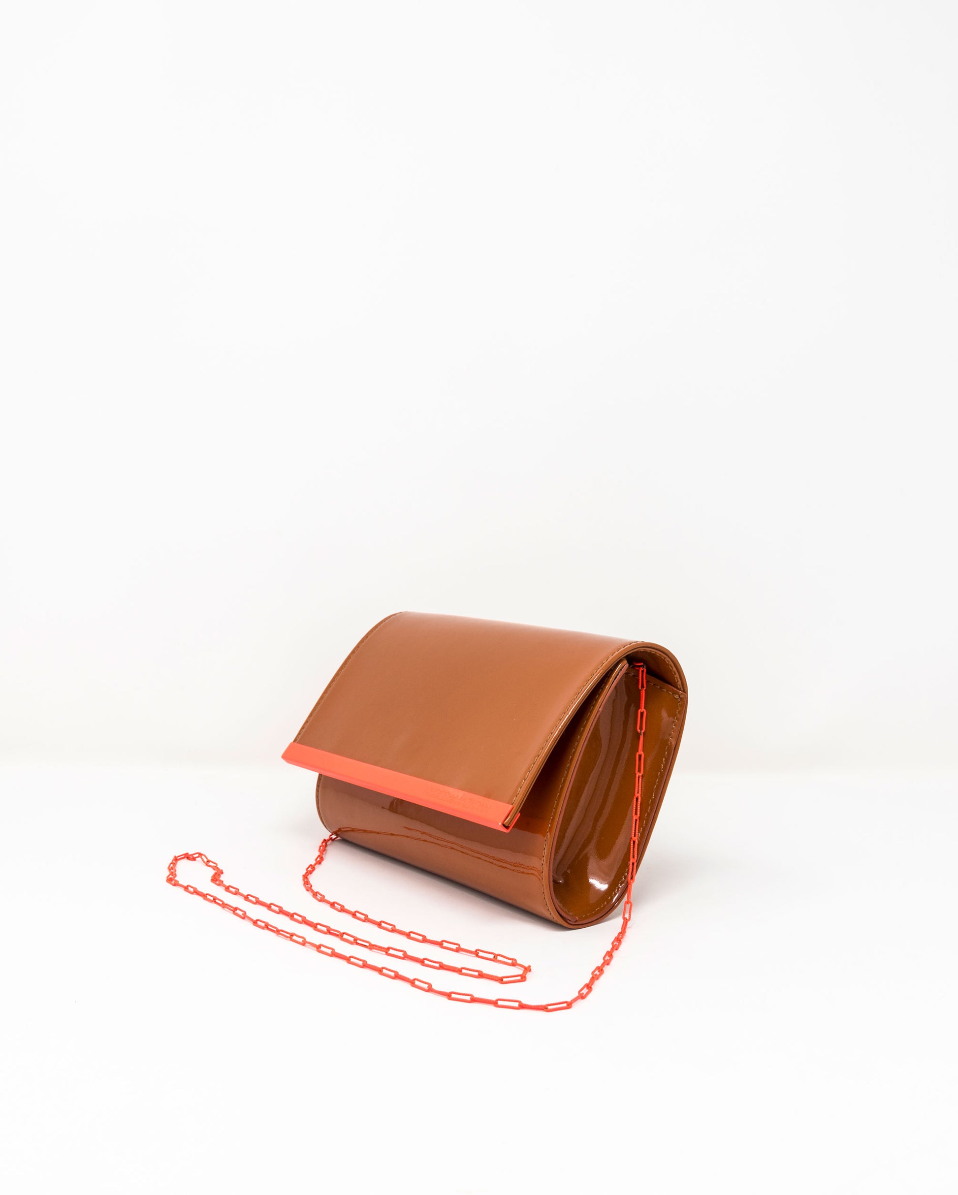 Borsa pochette in vernice, color cammello. Fodera interna in camoscio color viola. Dettagli in ottone color arancio fluo. La borsa può essere portare a mano oppure a tracolla, grazie alla catenina in dotazione.