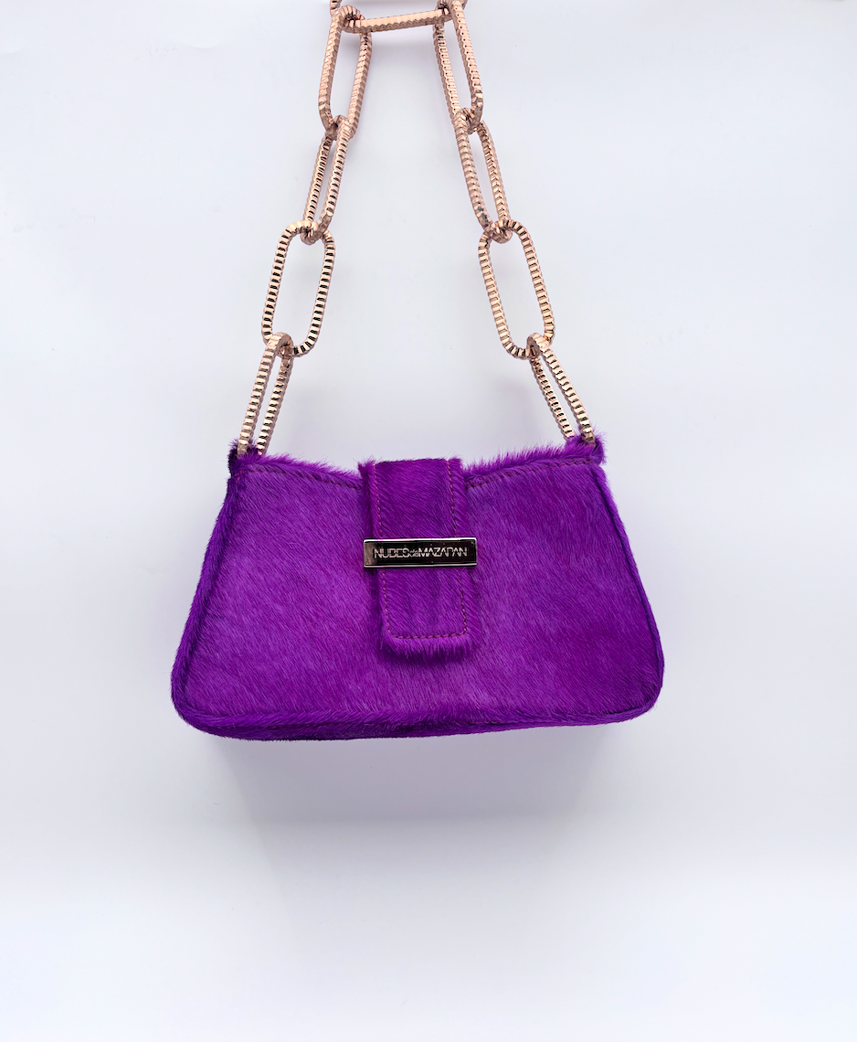 Borsa a tracolla in cavallino, colore viola. Fodera interna in camoscio color viola. Dettagli in ottone placcato oro.