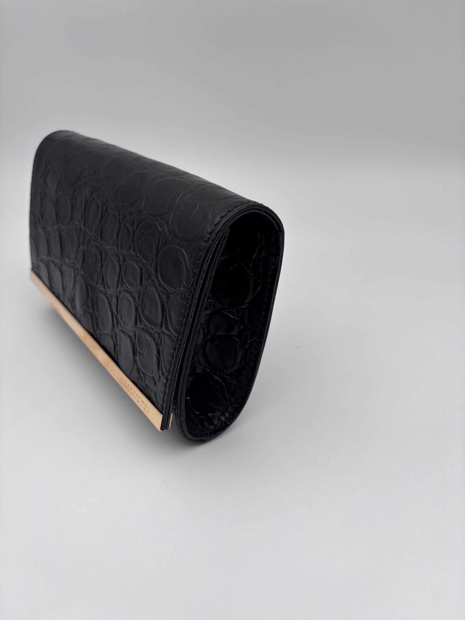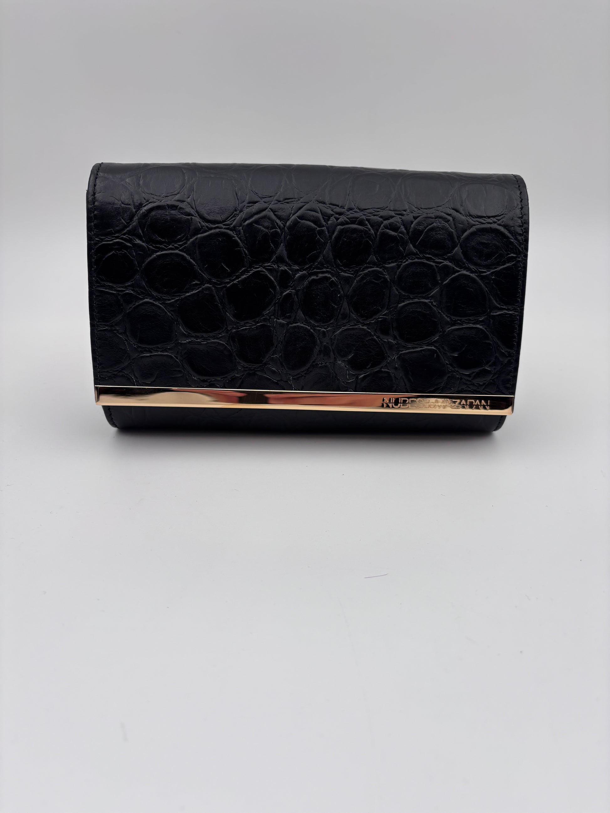 Borsa pochette in pelle di vitello stampato cocco, colore nero. Fodera interna in camoscio color viola. Dettagli in ottone color oro. La borsa può essere portare a mano oppure a tracolla, grazie alla catenina in dotazione.